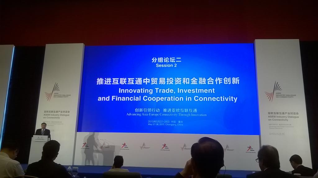 (通讯员彭子洋)2015年5月27日下午,我院商务系副主任张红梅和骨干教师彭子洋获邀参加亚欧互联互通产业对话会(ASEM Industry Dialogue on Connectivity)的分组论坛——“推进亚洲与欧洲互联互通中的贸易投资和金融合作创新”。国务院发展研究中心外经部长赵晋平、财政部亚太中心副主任周强武和来自柬埔寨、丹麦、匈牙利、德国、卢森堡等国家的与会嘉宾发言,多国专家和学者就主题展开了讨论。